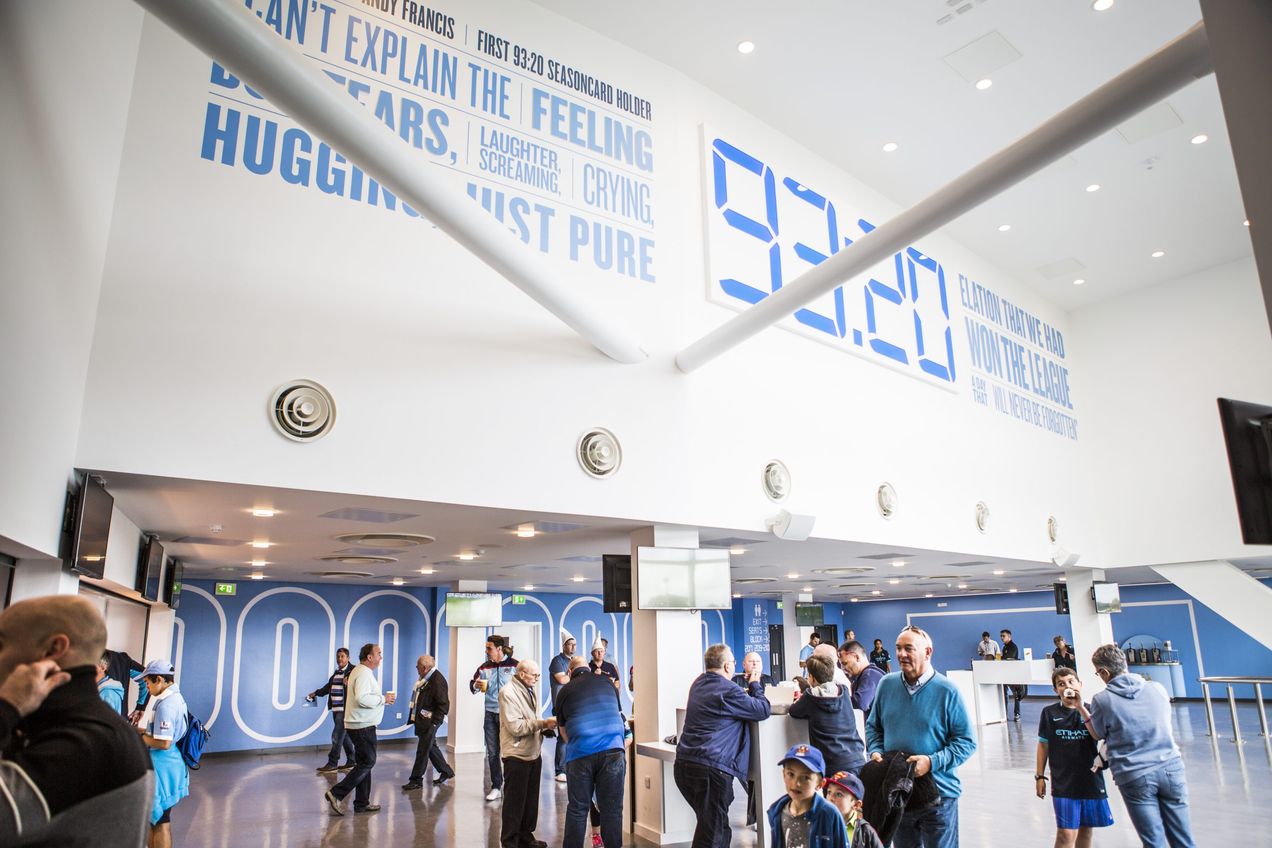 The 93:20 Lounge gives access to middle-tier padded seats on Etihad Stadium’s longside. Enjoy a clear view of Manchester City on the field.